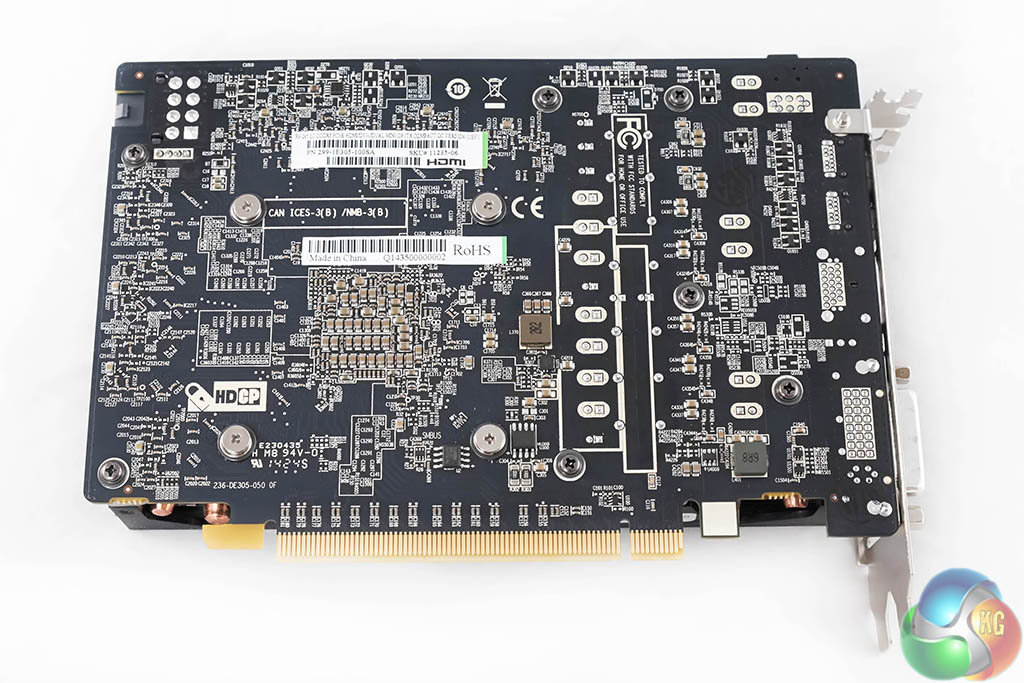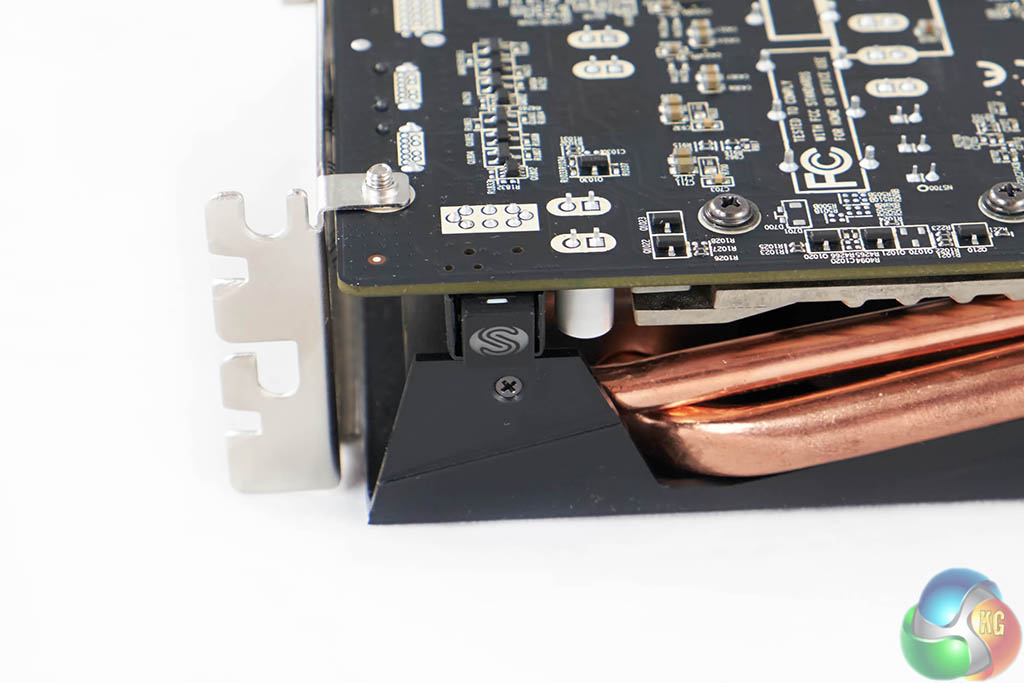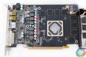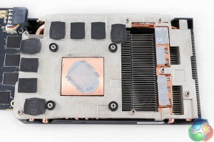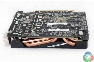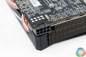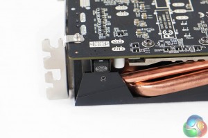 The cooling system is hidden behind a metal plate – which offers active cooling for the 2GB of GDDR5 memory. There are 2 thick copper heatpipes which connect to the copper heatsink and they run into aluminum fins on either side. Sapphire are using Elpida GDDR5 memory.