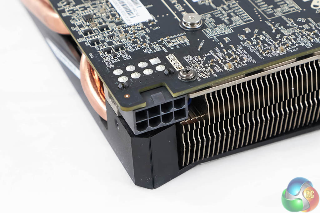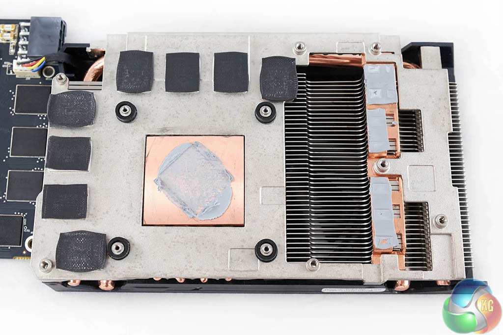 Looking down on the card from the top, we can see the compact cooling system, with several thick copper heatpipes.