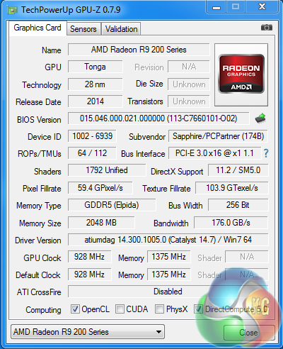 The R9 285 is built on the 28nm process. It has 64 ROPS, 112 texture units and 1,792 Stream processors. The 2GB of GDDR5 memory is connected via a 256 bit memory bus. The core is overclocked to 928mhz, and the memory is running at 1,375mhz (5.5Gbps effective).