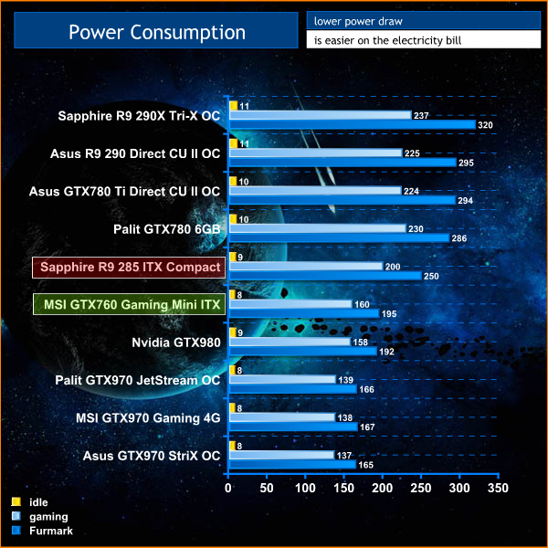 The Sapphire R9 285 ITX Compact is the more power hungry graphics card, taking around 200 watts when gaming. This rises to 250 watts under synthetic Furmark load. The MSI GTX760 Gaming Mini ITX by comparison only takes 160 watts when gaming.