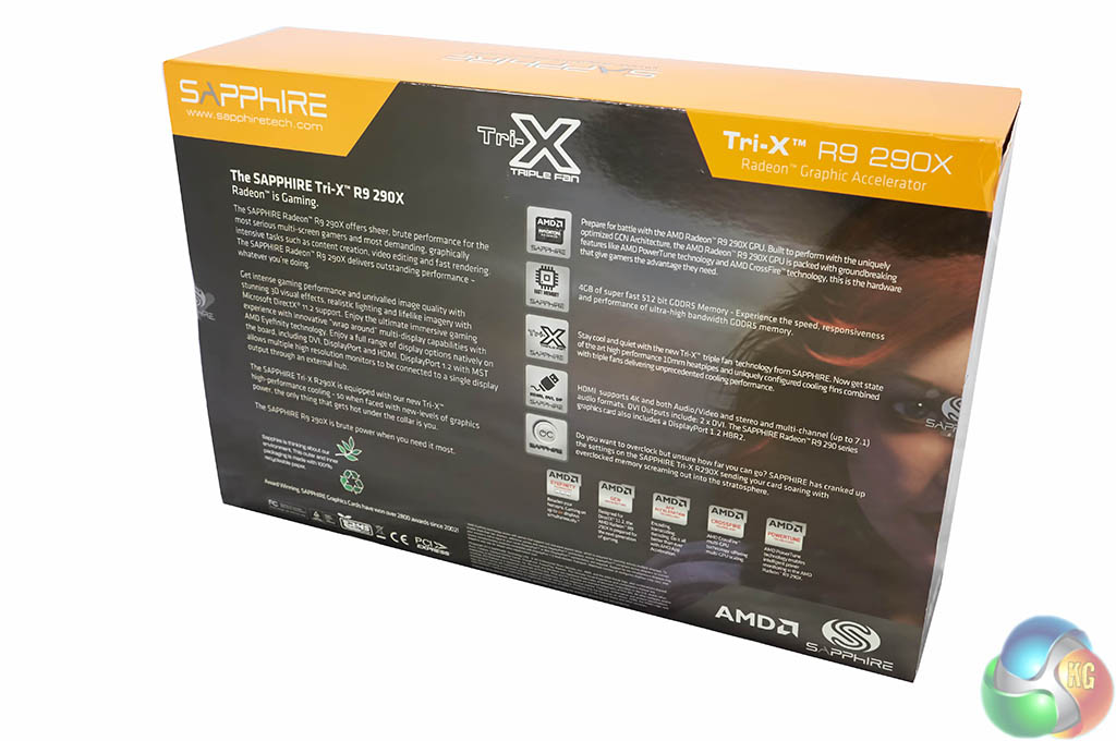 Some specifications are listed on the rear of the box, including ‘4GB of super fast 512bit GDDR5 memory'. Its 8GB, not 4GB and Sapphire are obviously just reusing the old box. Tsk.