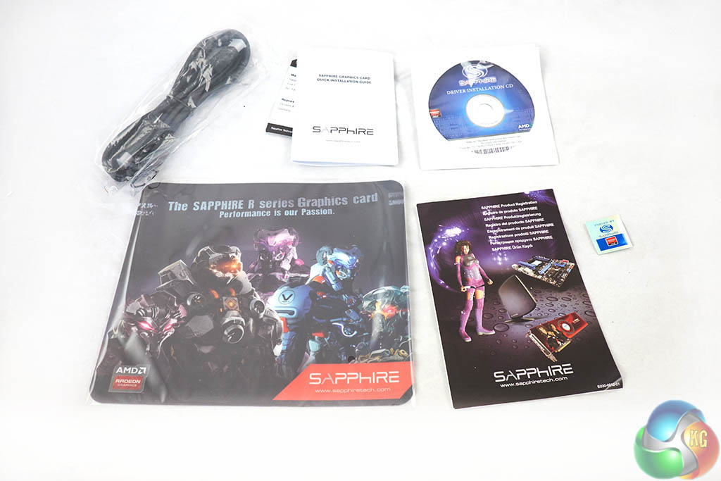 The bundle is quite good. You get literature on the product, a case sticker, software disc (best grabbing new drivers direct from AMD's website), and a high grade 1.8 meter HDMI cable.