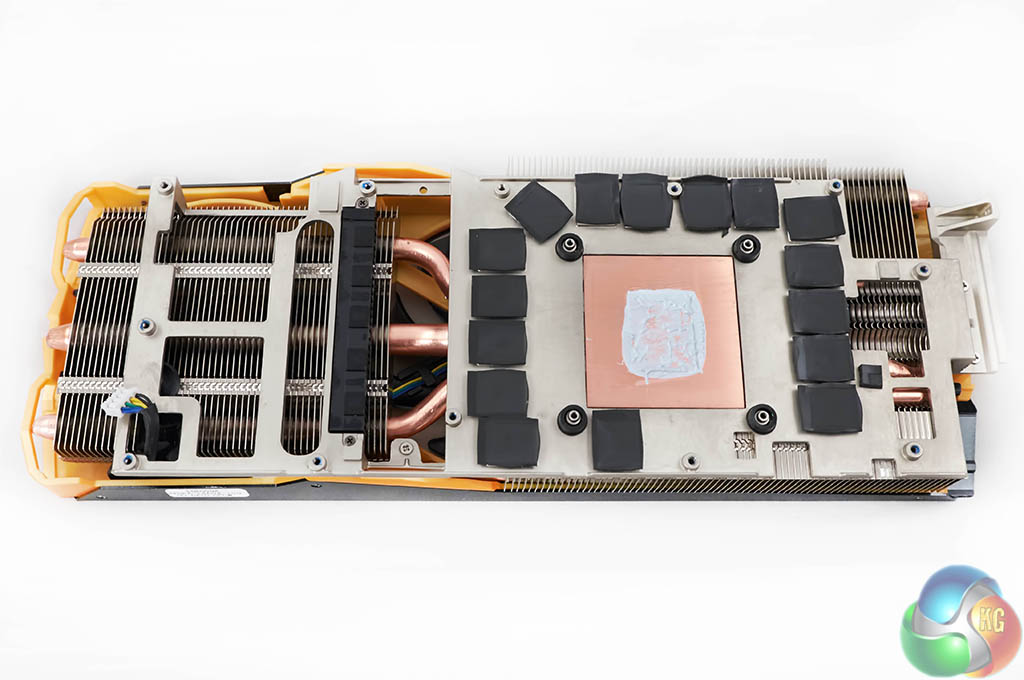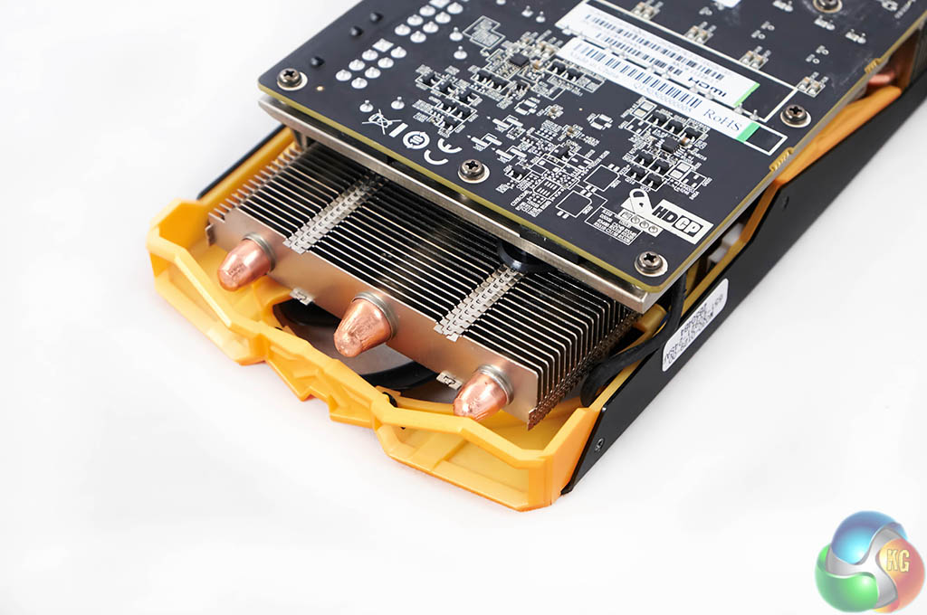 The card disassembled, highlighting the excellent TriX cooler which features monster 10mm heatpipes. The Tri-X cooler comprises five 10mm copper heatpipes – two of which bend 180 degrees backwards from the core block into a secondary set of aluminum fins.