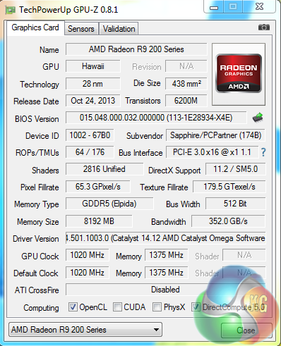 Release date October 2013, a sign of how old this hardware is getting now. The Hawaii CPU is built on the 28nm process and has 64 ROPS, 176 Texture units, and 2816 Stream processors. The 8GB of GDDR5 memory is connected via a wide 512 bit memory interface. Sapphire have overclocked both core and memory from 1,000mhz to 1,020mhz and 1,250mhz to 1,375mhz respectively (5.5Gbps effective).