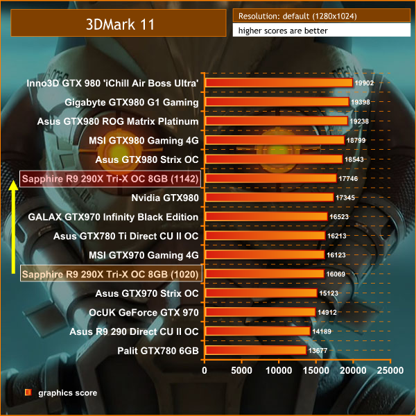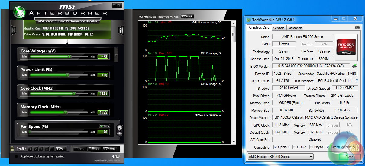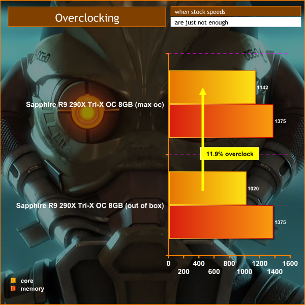 The tweaked core speeds helped improve the performance significantly. In 3DMark11 for instance, the Sapphire R9 290X Tri-X OC 8GB was closely matched against the MSI GTX970 Gaming 4G. After pushing the core speed to 1,142mhz the final score was higher than the reference clocked GTX980. It is well worth taking the time to push the Hawaii core as far as possible.