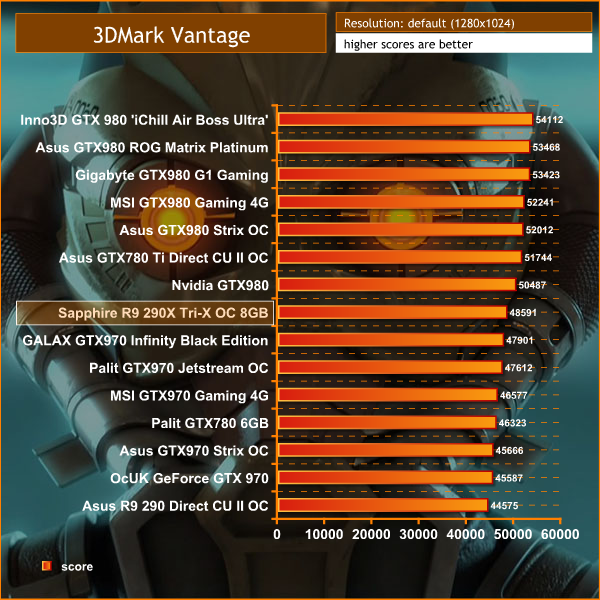 The Sapphire R9 290X TriX OC 8GB scores 48,591 points, around 2,000 points behind the reference Nvidia GTX980.