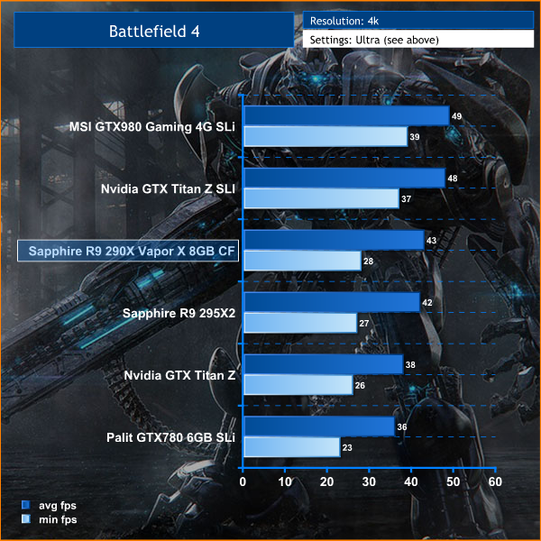 Quad SLI driver optimisations could be better in this game, as the MSI GTX980 Gaming 4G cards in SLI claim the top spot. The Sapphire R9 290X Vapor X 8GB cards score well, averaging 43 frames per second, just slightly ahead of the R9 295X2.