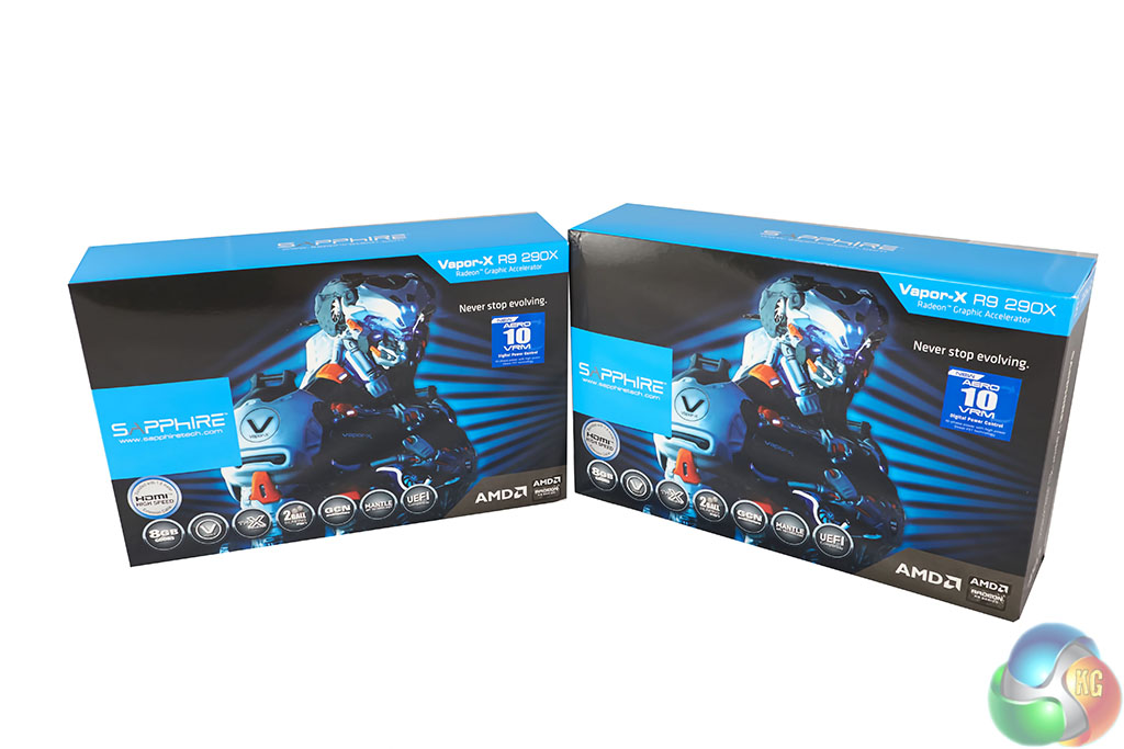 The Sapphire R9 290X Vapor X 8GB ships in a large blue box featuring a futuristic robot.