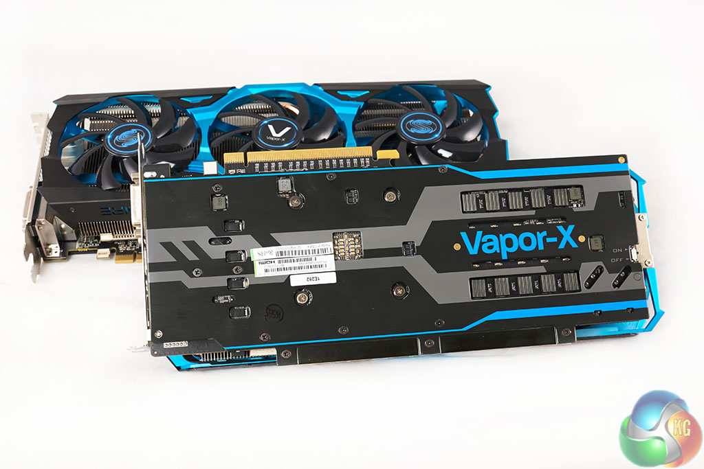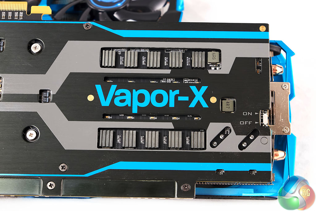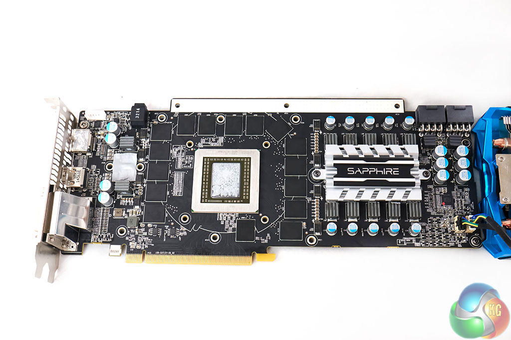 You may have seen the white strip running along the top of the card, close to the two 8 pin power connectors. Sapphire’s engineering team have left one of the copper layers exposed. An additional heatsink mounted direct to the copper layer means that heat can be absorbed into the PCB from the GPU, then transferred out. Sapphire claim a reduction in overall temperature by ‘several degrees’.
