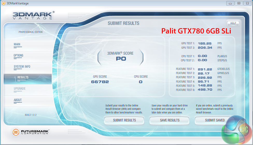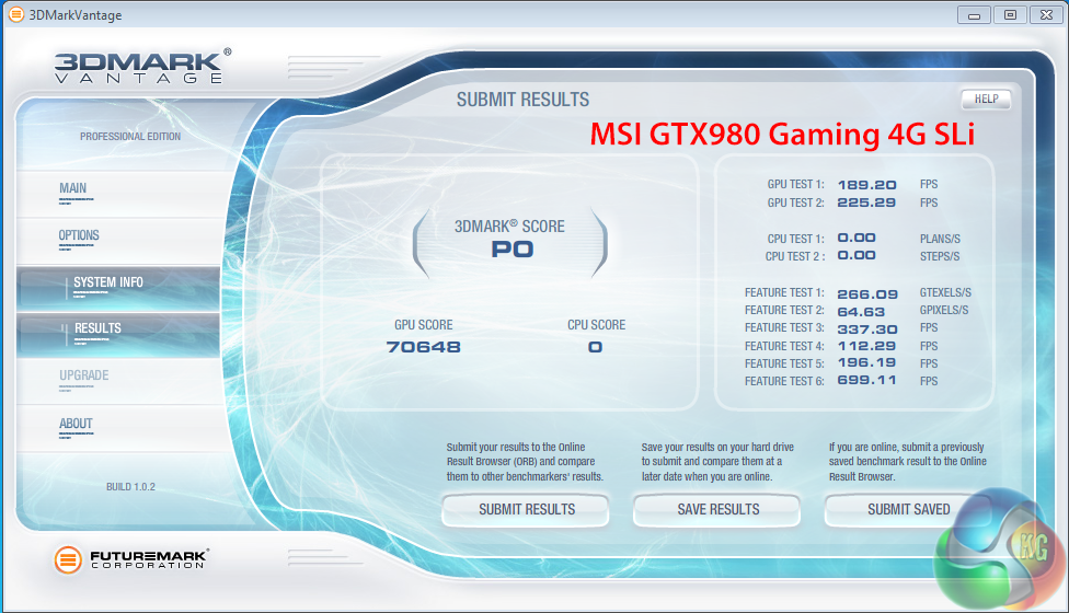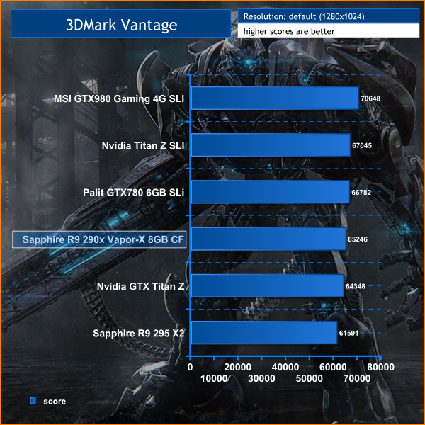 We normally include this older Direct X 10 benchmark in the mix and we can see that the MSI GTX980 Gaming 4G cards come out top in SLi. Two Nvidia GTX Titan Z's in Quad SLI struggle to match the results.