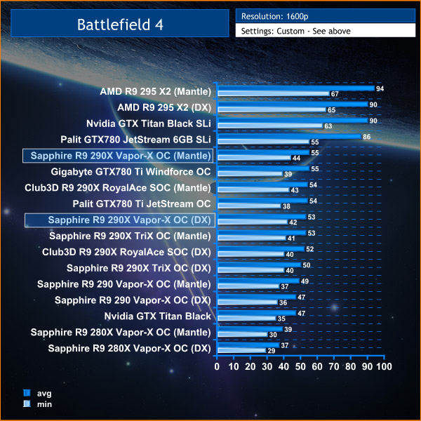 We test at 2560×1600 with the image quality settings on the ‘ULTRA’ preset. We test the AMD hardware with both Direct X and AMD’s Mantle rendering. Nvidia hardware is tested with Direct X rendering.