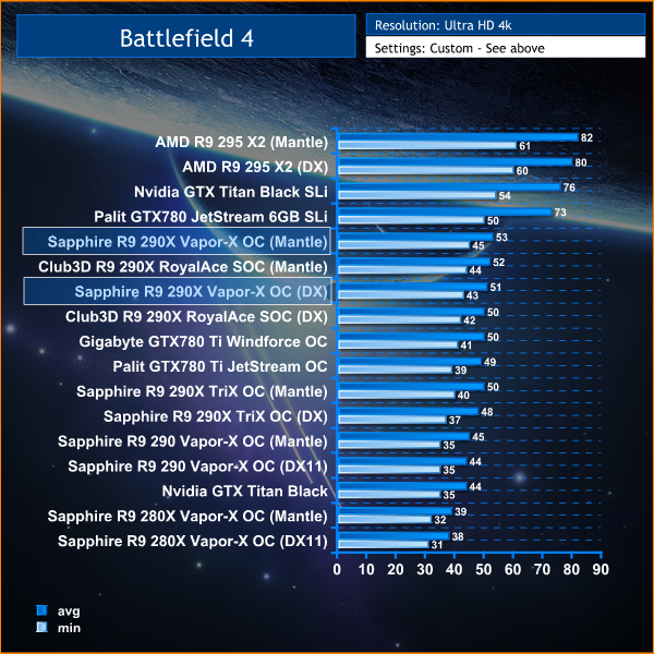 We drop the image quality settings a little at Ultra HD 4K, because the only card that can handle that level of IQ is the R9 295 X2. Frame rates from the Sapphire R9 290X Vapor-X OC are smooth, holding well above 40 at all times.
