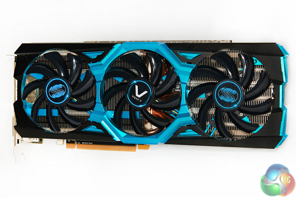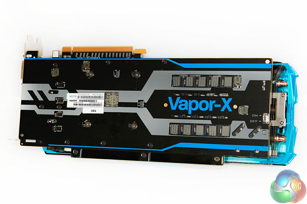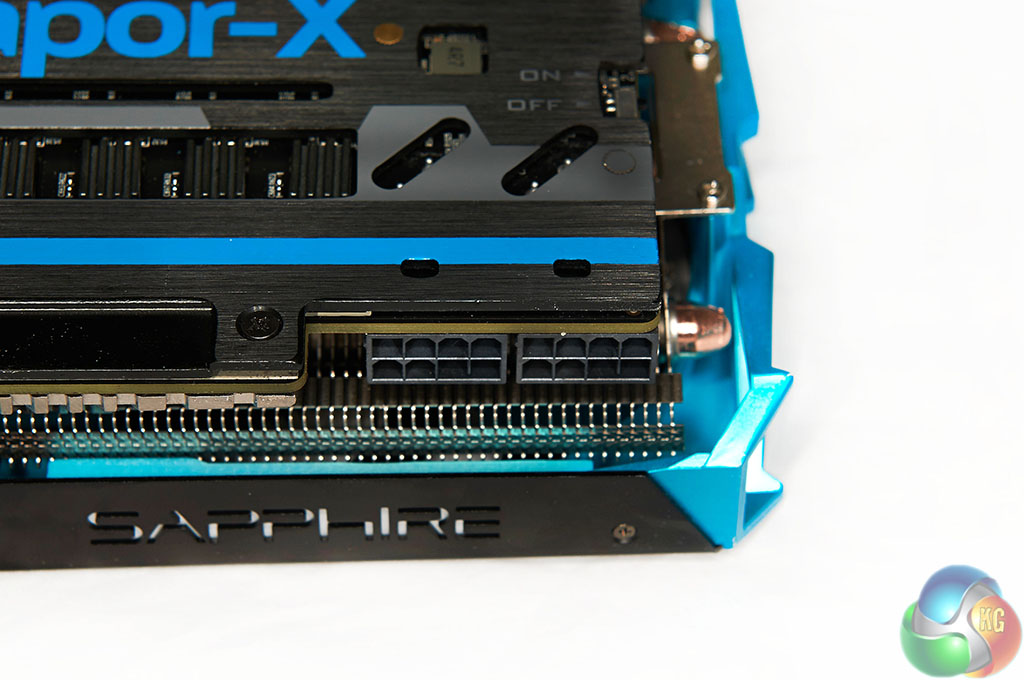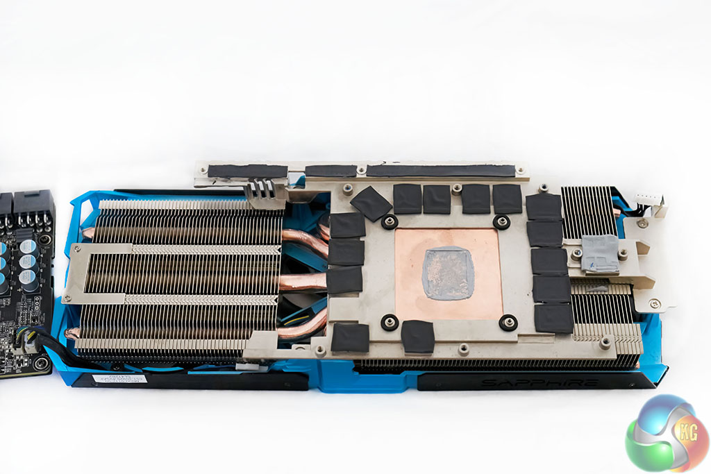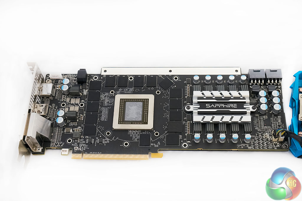 If you have been paying attention you may have seen the white strip running along the top of the card, close to the two 8 pin power connectors. Sapphire’s engineering team have left one of the copper layers exposed. An additional heatsink mounted direct to the copper layer means that heat can be absorbed into the PCB from the GPU, then transferred out. Sapphire claim a reduction in overall temperature by ‘several degrees’.