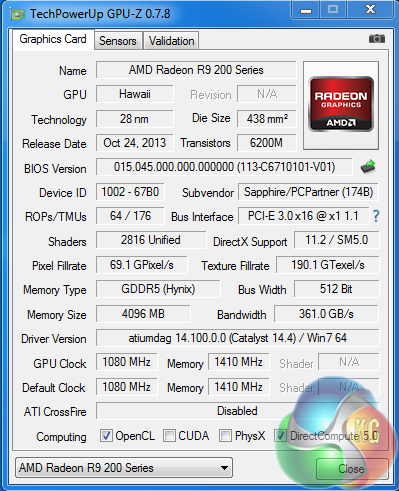 The Sapphire R9 290X Vapor-X OC is overclocked to 1,080mhz. It has 64 ROPS, 176 Texture units and 2,816 unifed shaders. The 4GB of SKHynix memory is connected via a 512 bit memory interface. The memory is overclocked to 1,410mhz (5.64Gbps effective).