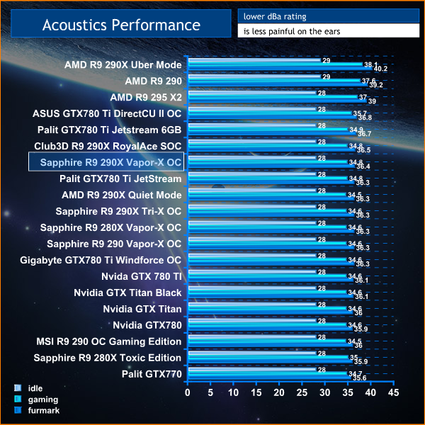 We measure from a distance of around 1 meter from the closed chassis and 4 foot from the ground to mirror a real world situation. Ambient noise in the room measures close to the limits of our sound meter at 28dBa. It isn’t a real world situation to be measuring with a case panel off only a few centimeters away from a video card. Our noise figures may therefore be lower than other publications who record at closer distances, or without a fully closed case muting the noise.