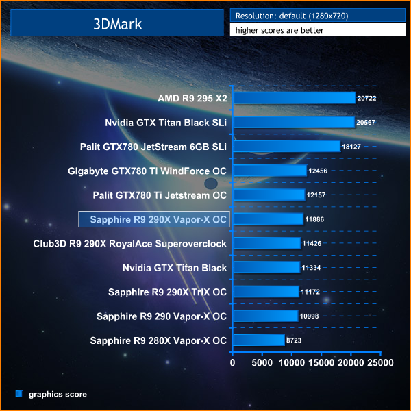 The Sapphire R9 290X Vapor-X OC is the highest performing single GPU AMD card we have tested so far, scoring 11,886 points – slotting in just behind the Palit GTX 780 Ti Jetstream OC.