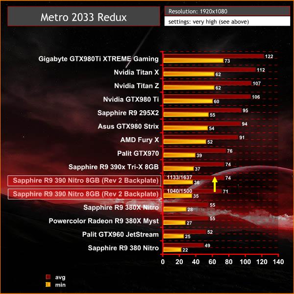 Metro 2033 Redux is a remake of the original game, with enhanced graphics. We often test with Metro Last Light Redux, but decided to mix things around for this review today. We test at 2560×1440 with the following settings: Quality-Very High, SSAA-off, Texture Filtering-16x, Motion Blur-Normal, Tessellation-Normal, Advanced Physx-off.