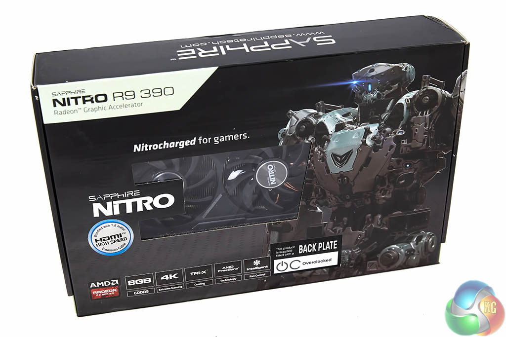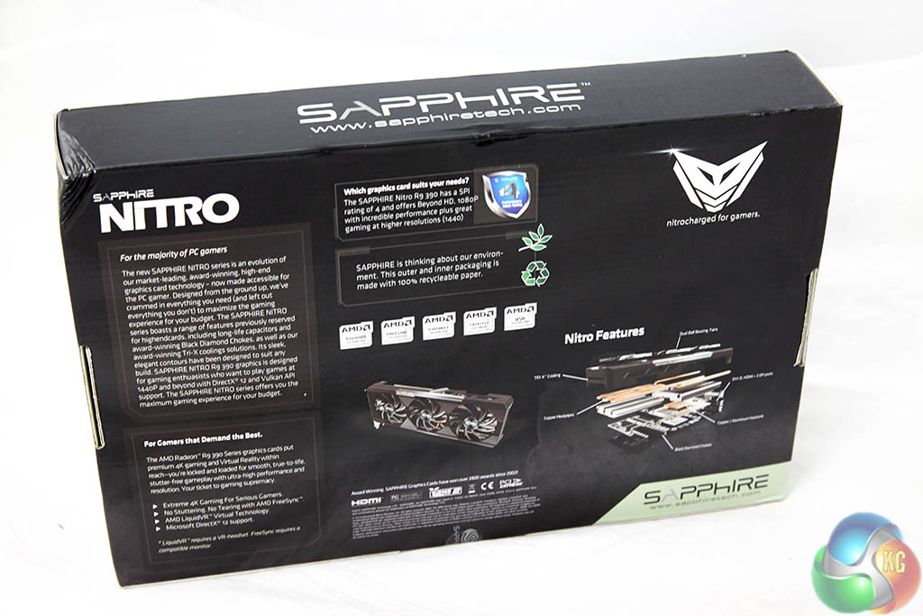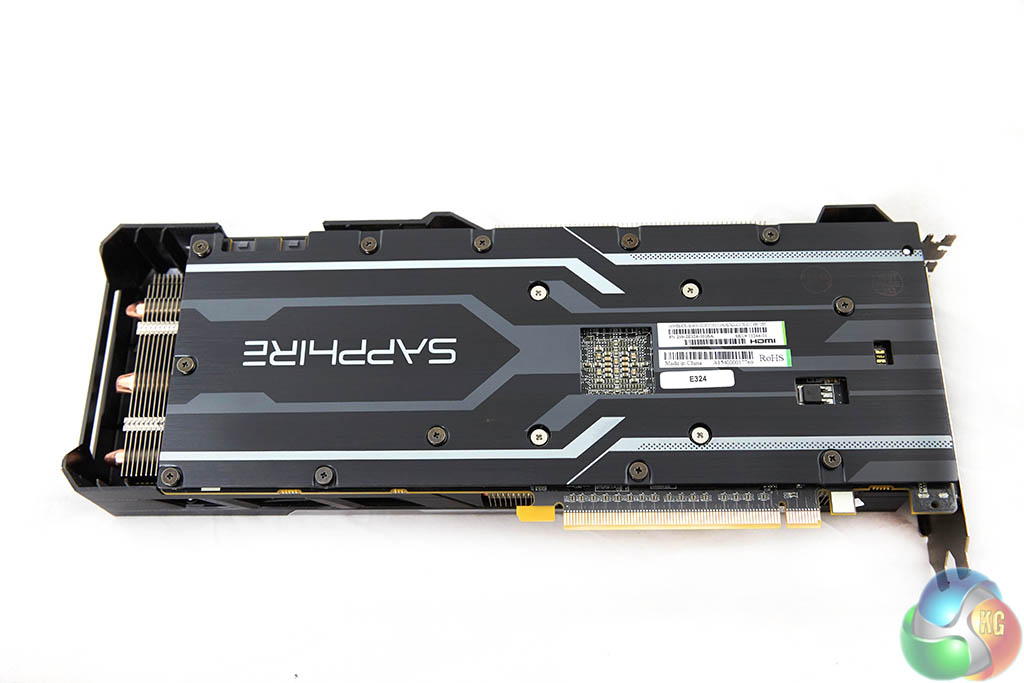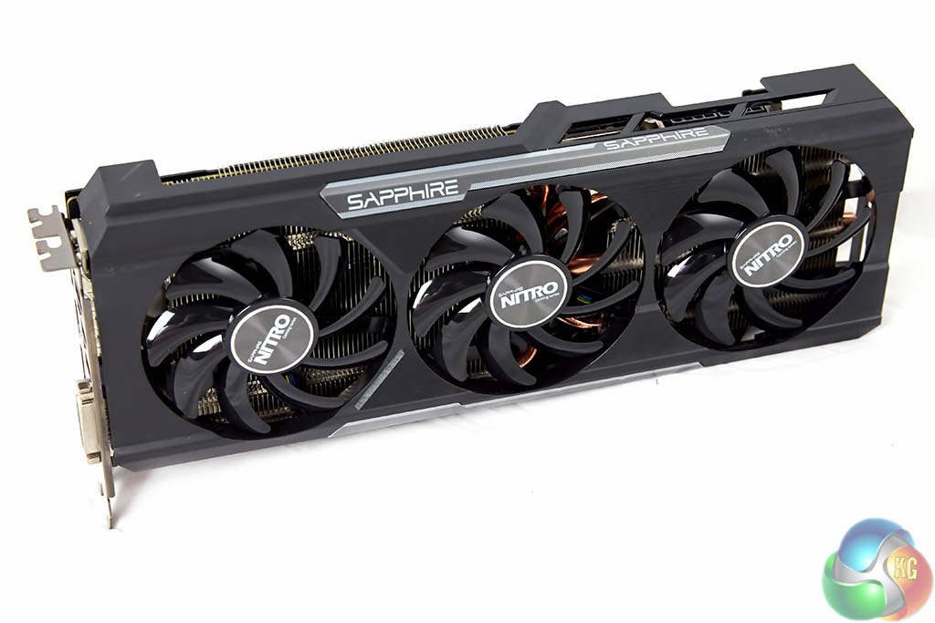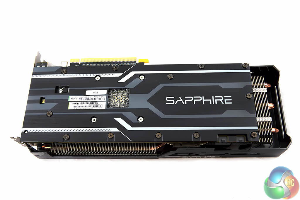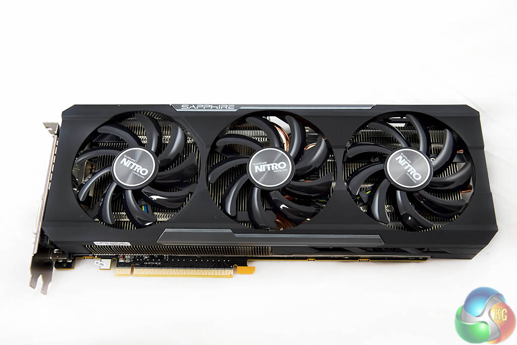 The Nitro range of cards follow a very specific style – they are predominately black with silver accenting. It is a good looking card with three fans taking up the full length of the PCB underneath. This time there is a ‘Sapphire' branded backplate fitted to the PCB which will hopefully reduce the hotspots we noticed last time we tested this solution.