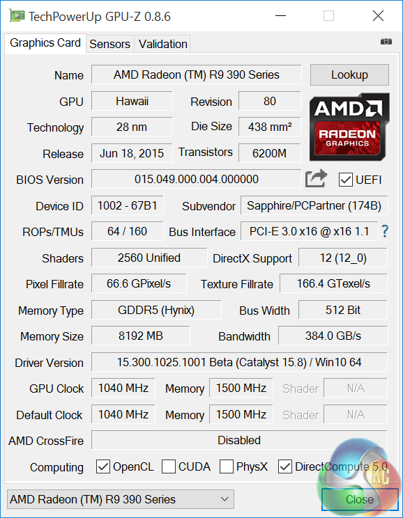 An overview of the Sapphire R9 390 Nitro 8GB Rev 2 w/ Backplate. It is built on the 28nm process, has 64 ROPs, 160 Texture units, and 2560 unifed shaders. The core is clocked at 1040mhz, 30mhz faster than ‘Revision 1' which we reviewed in July. The 8GB of GDDR5 memory runs at 1,500mhz, or 6Gbps effective – an improvement over the R9 290, which on the reference design was set at 5Gbps effective.