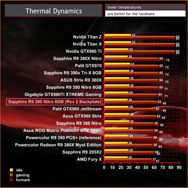 The image directly above is the original thermal image from the first revision Sapphire R9 390 Nitro 8GB (without backplate) which we tested back in July this year. If you ever needed to see the difference a backplate can make, this is a good indication. Almost 30c difference under extended load.