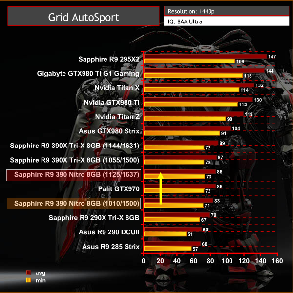 The Palit GTX970 manages to outperform the Sapphire R9 390 Nitro 8GB – thanks to improvements in Nvidia driver code in recent months. When we overclock the Sapphire R9 390 manually, the difference is negated completely. That said, if we took a pure ‘apples to apples approach' and overclocked the Palit GTX970, it would pull out in front again.