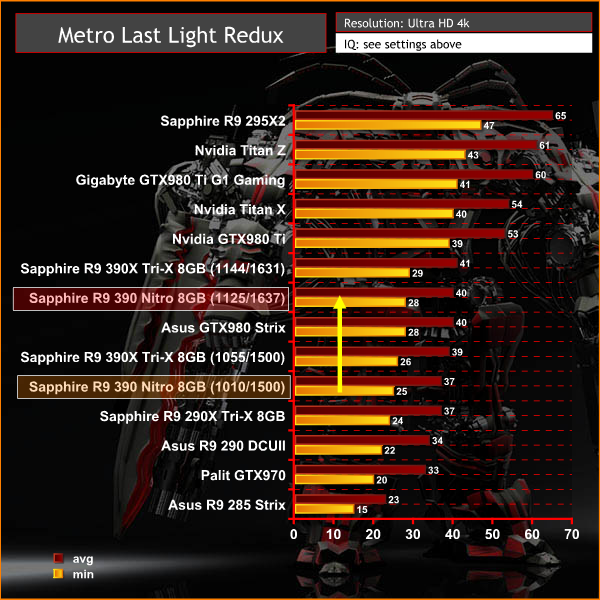 On May 22, 2014, a Redux version of Metro Last Light was announced. It was released on August 26, 2014 in North America and August 29, 2014 in Europe for the PC, PlayStation 4 and Xbox One. Redux adds all the DLC and graphical improvements. A compilation package, titled Metro Redux, was released at the same time which includes Last Light and 2033. (Wikipedia). We test with following settings: Quality- High, SSAA-off, Texture Filtering-16x, Motion Blur-Normal, Tessellation-Normal, Advanced Physx-off.