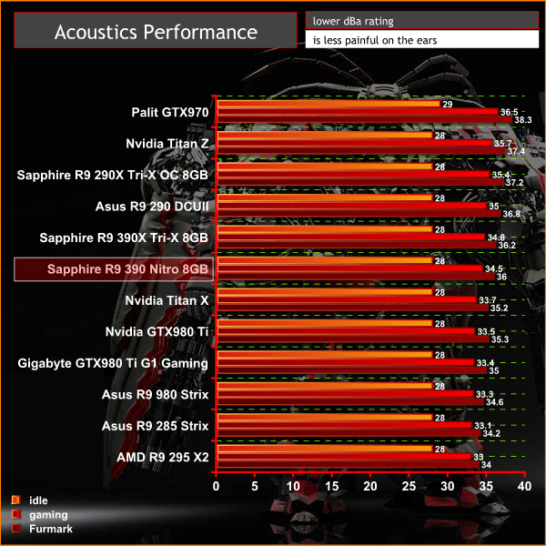 Not the quietest card we have tested, but not intrusive either. When idle the fans spin down, and the graphics card could be classed as basically silent. Under heavier load the fans spin up and when gaming, hit a peak around 34.5dBa.