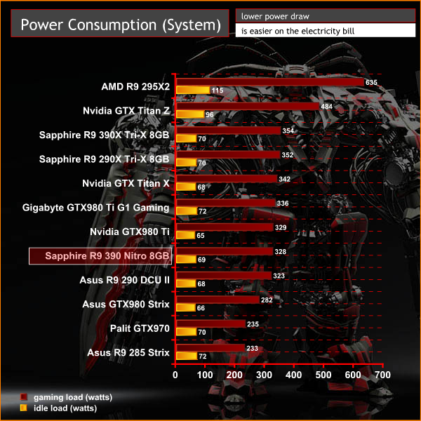 This architecture from AMD is showing its age now in regards to power consumption. This system demands around 330 watts when gaming – swapping over to the GTX970 drops the power consumption of the system by close to 100 watts.