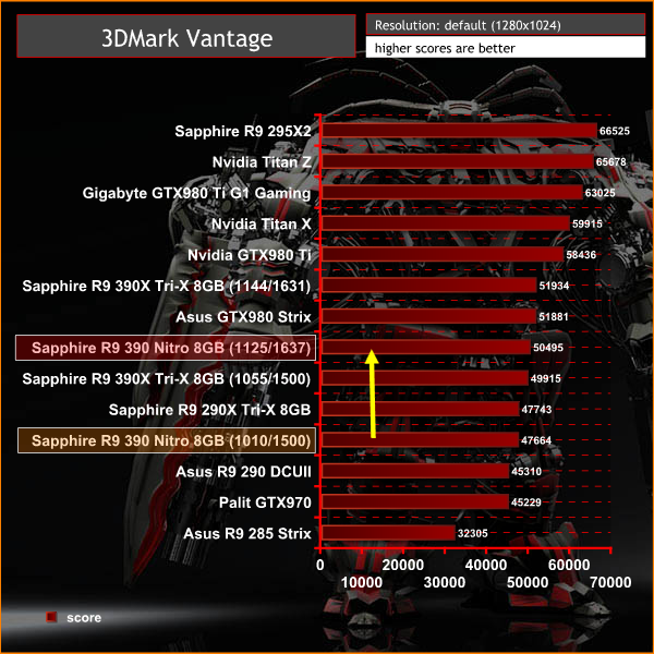 The stock clocked R9 390 slots in between the Asus R9 290 DCUII and the R9 290X Tri-X 8GB in the performance chart. When overclocked, the R9 390 Nitro 8GB is actually able to outperform the standard clocked Sapphire R9 390X Tri-X 8GB. Impressive first indicators.