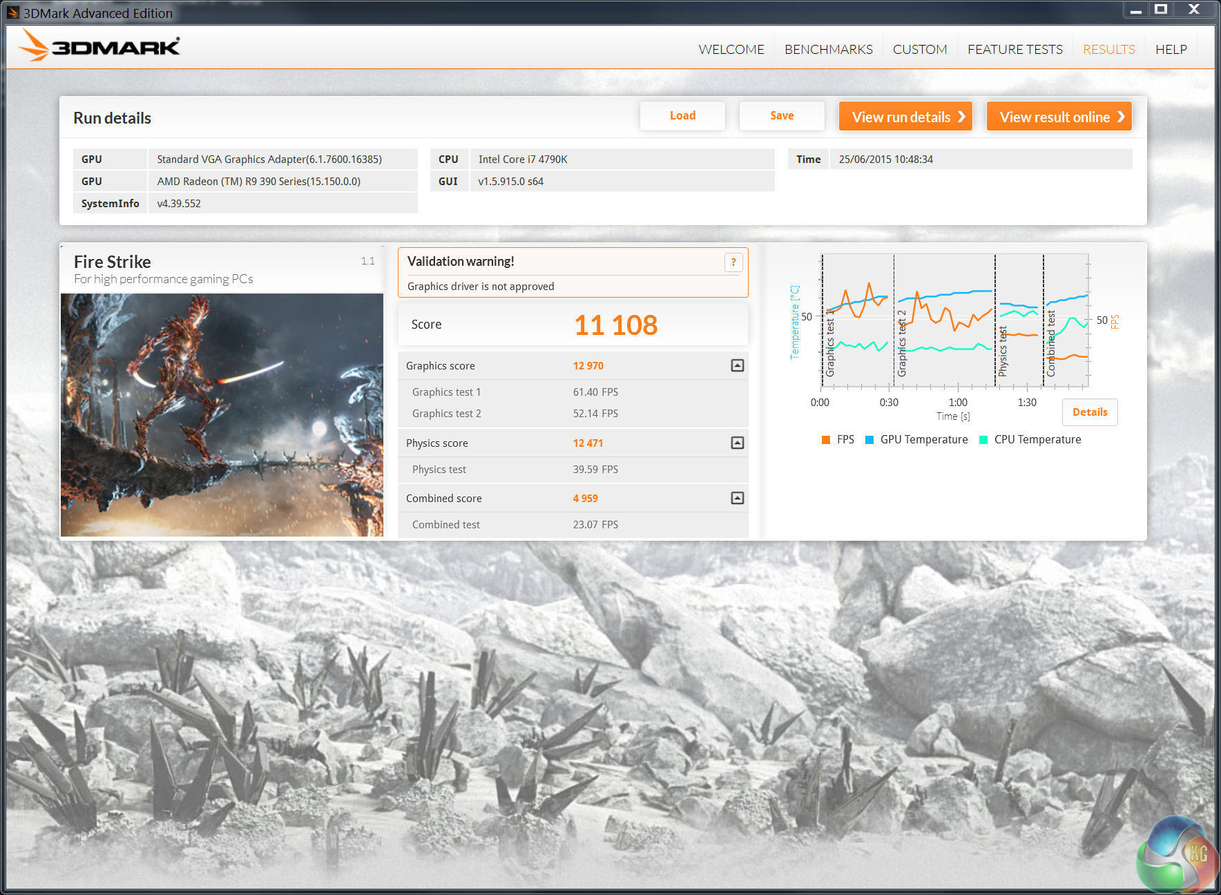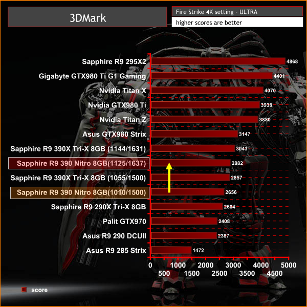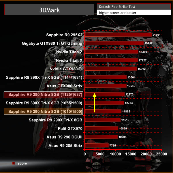 The R9 390 Nitro performs very well in the latest Direct X 11 Futuremark benchmark and when overclocked it manages to outperform the (considerably) more expensive Sapphire R9 290X 8GB Sapphire Tri-X.