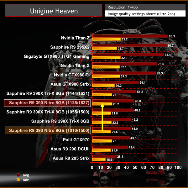 AMD has always lagged behind Nvidia in regards to outright Tessellation performance however we can see the newer cards are performing a little better. The Palit GTX970 is outperformed by the Sapphire R9 390 Nitro, even before we overclock it. When overclocked the R9 290 Nitro manages to outperform the reference clocked R9 390X Tri-X. The Asus GTX980 Strix is still some way ahead of both Sapphire solutions, as we would expect considering the price differential.