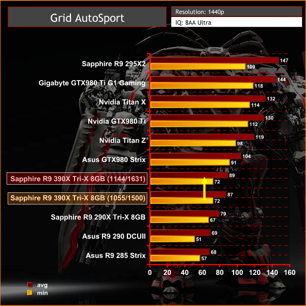 The Sapphire R9 390X Tri-X 8GB is well ahead of the older R9 290X Tri-X 8GB, although noticeable short of the GTX980, which is around 15 frames per second faster at these settings.