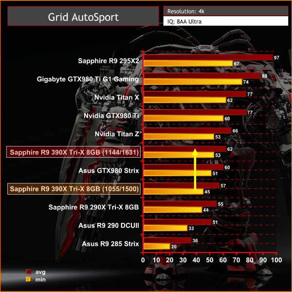 At Ultra HD 4K, the Sapphire R9 390X Tri-X 8GB can be manually overclocked to outperform the Asus GTX980 Strix, by 2 frames per second.