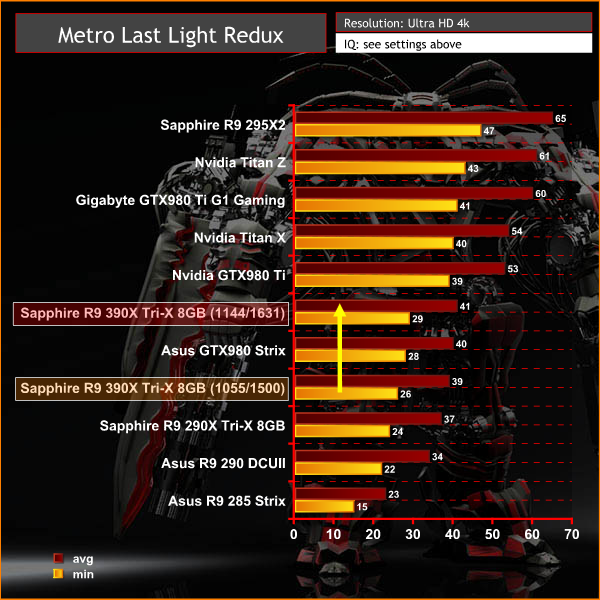 On May 22, 2014, a Redux version of Metro Last Light was announced. It was released on August 26, 2014 in North America and August 29, 2014 in Europe for the PC, PlayStation 4 and Xbox One. Redux adds all the DLC and graphical improvements. A compilation package, titled Metro Redux, was released at the same time which includes Last Light and 2033. (Wikipedia). We test with following settings: Quality- High, SSAA-off, Texture Filtering-16x, Motion Blur-Normal, Tessellation-Normal, Advanced Physx-off.