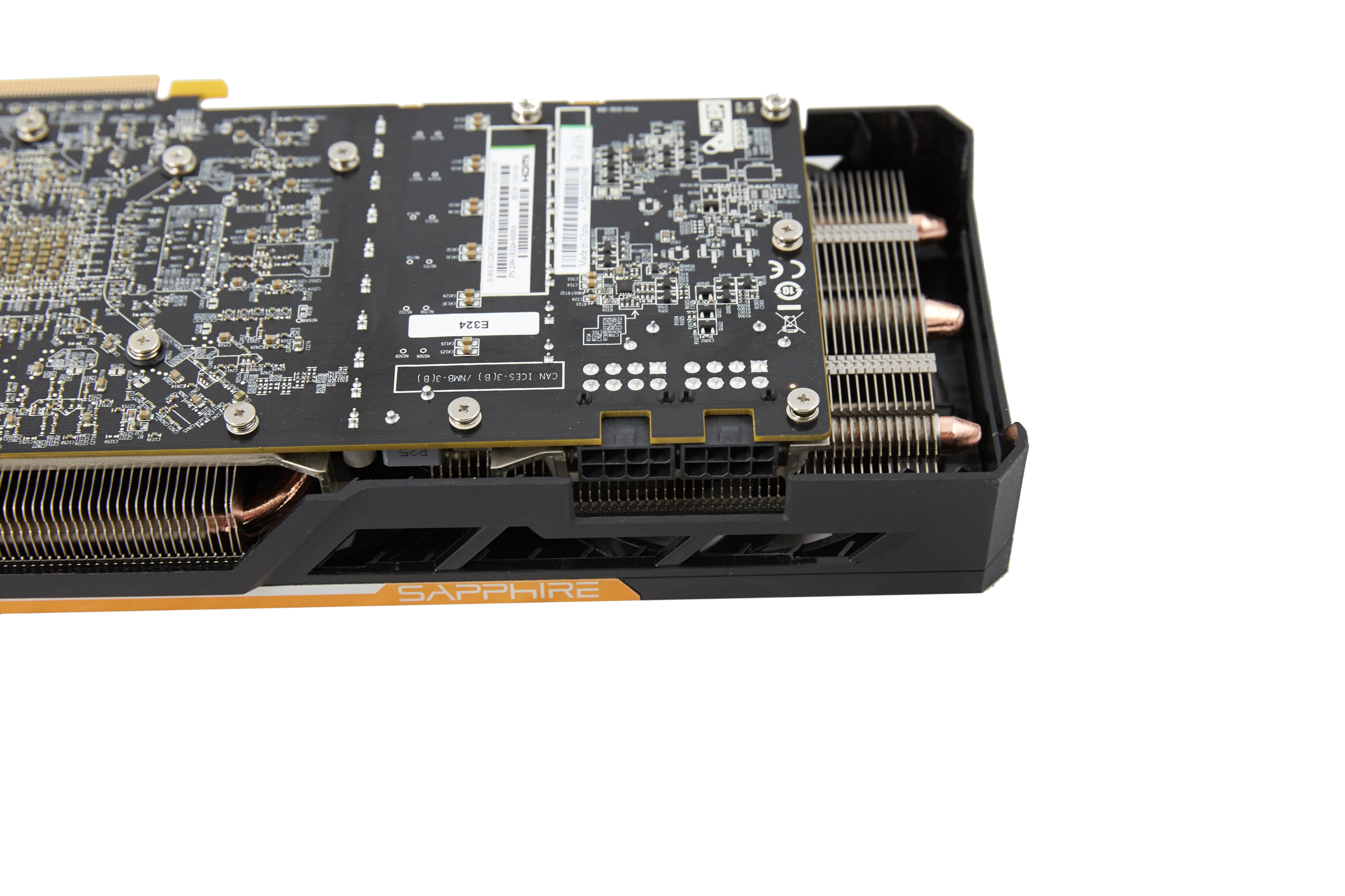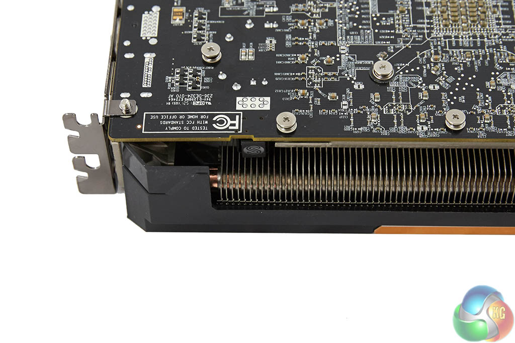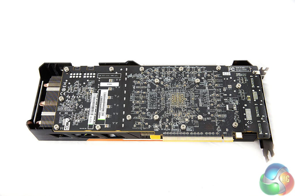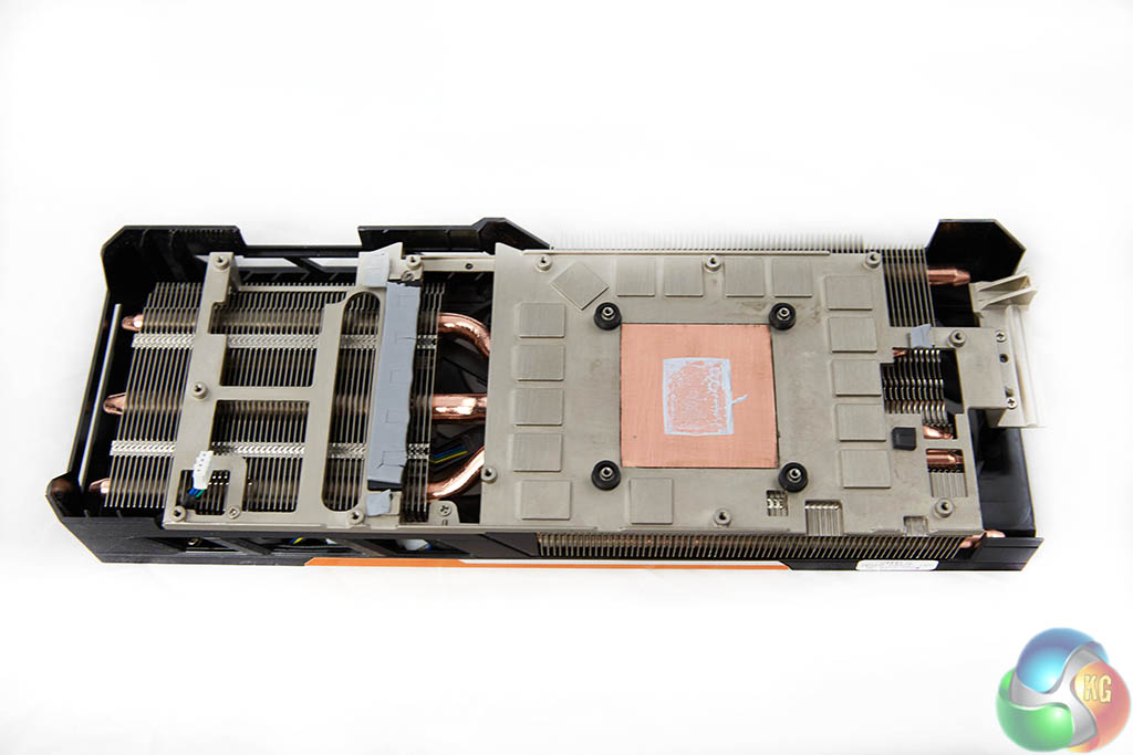 Due to all the screws, it takes quite some time to remove the cooler. We can see the GDDR5 memory is directly cooled from the heatsink above. Thick heatpipes expel heat from the copper heatpipe, across a large rack of aluminum fins which span the full width of the PCB.