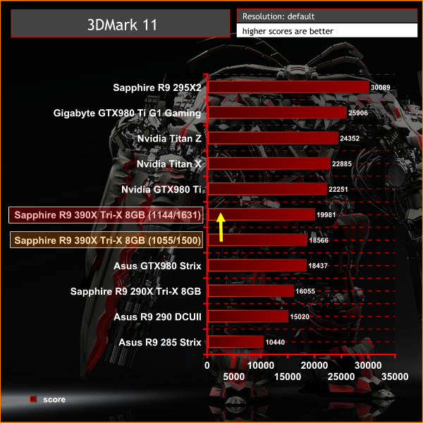 AMD hardware scores well in the older Direct X 11 benchmark suite from Futuremark. We can see the Sapphire R9 390X Tri-X 8GB manages to outperform the Asus GTX980 Strix by around 100 points – nothing much in it at all. Obviously overclocking the hardware reaps reward, increasing the graphics score to 19,981 points.