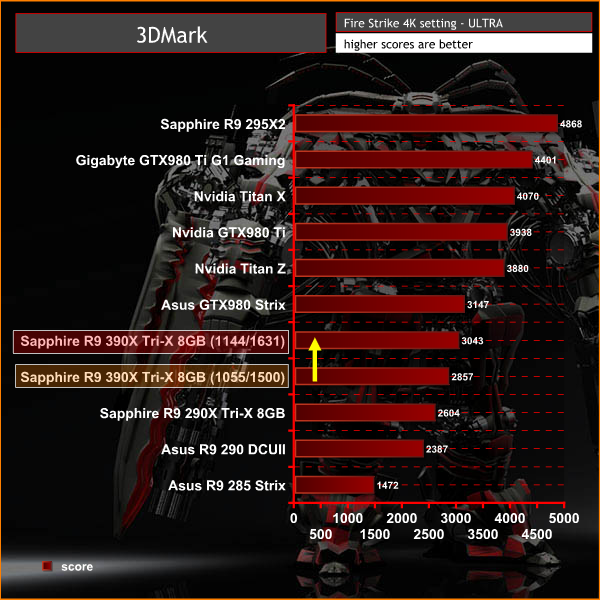 We tested at both the default setting and the ULTRA setting , to get 4K scores. We can see the Sapphire R9 390X Tri-X 8GB scores quite well, although it is outperformed by the Asus GTX980 Strix card at both resolutions. While overclocking the Sapphire card pushed the end result above the GTX980 at the lower resolution, the GTX980 remained ahead at 4K.