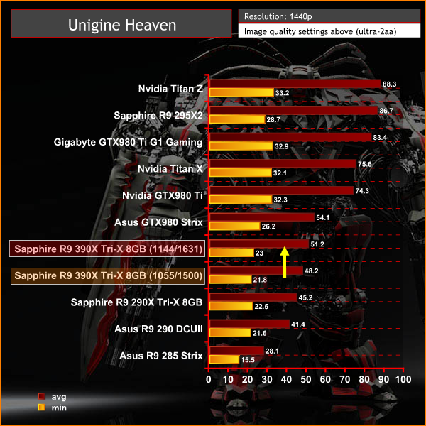 Performance from the R9 390X 8GB is noticeably higher than the R9 290X 8GB, although the card is still around 3 frames per second behind the GTX980.