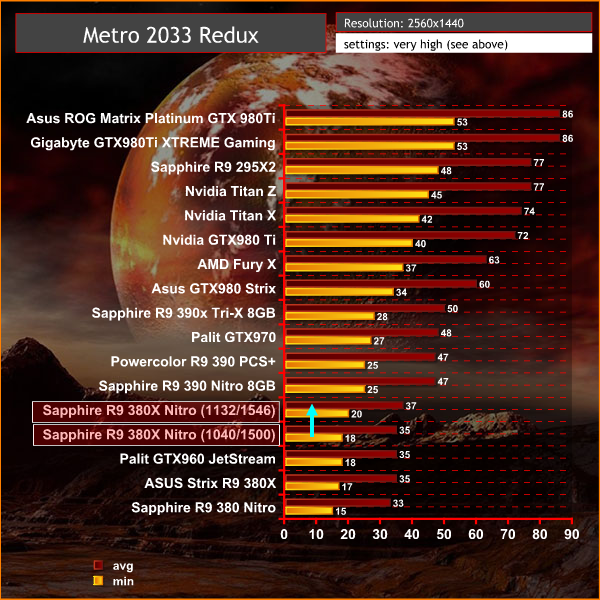 Metro 2033 Redux is a remake of the original game, with enhanced graphics. We often test with Metro Last Light Redux, but decided to mix things around for this review today. We test at 2560×1440 with the following settings: Quality-Very High, SSAA-off, Texture Filtering-16x, Motion Blur-Normal, Tessellation-Normal, Advanced Physx-off.