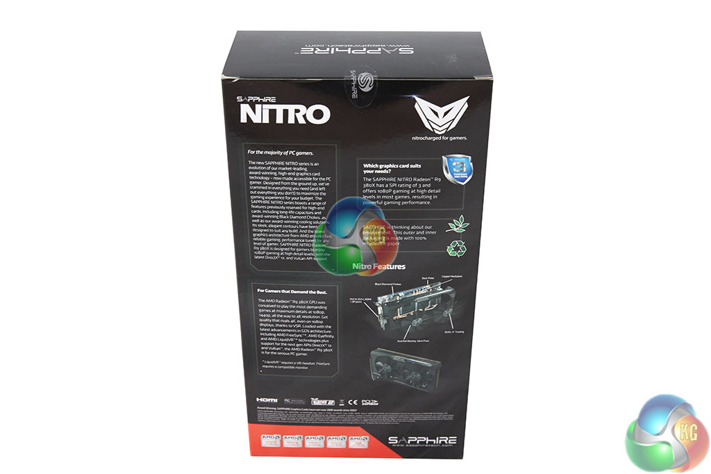 This time Sapphire have fitted the solution with a stylish backplate, which is always good to see. We already know from previous testing that the R9 380X isn't as hot running as a R9 390X, but a backplate will help reduce hotspots, and protect sensitive circuitry underneath.