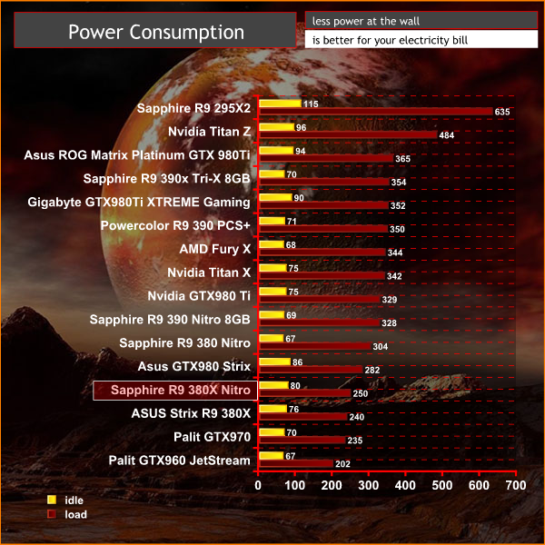 The Sapphire R9 380X Nitro consumes a little more power than the Asus Strix R9 380X under load — around 10 watts extra.
