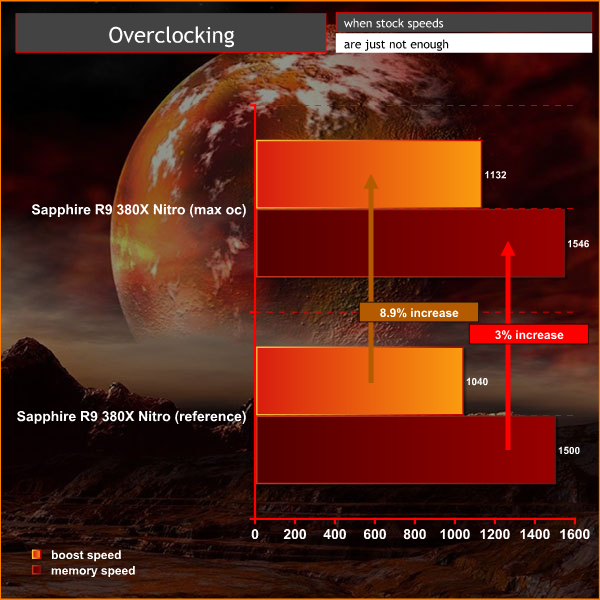 The Sapphire R9 Nitro 380X is highly overclocked out of the box, however there was another 9% available from our particular review sample. The GDDR5 memory is already clocked higher than AMD's reference card, although we managed to get a little more from it before artifacting would occur. Better results would likely have been possible if Sapphire had adopted Sk hynix or Samsung memory, rather than Elpida.