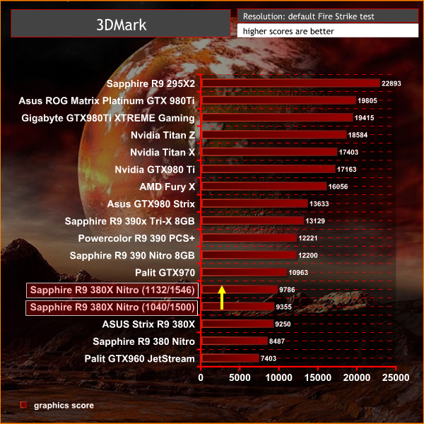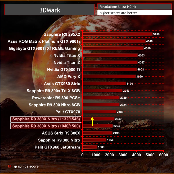 The Sapphire Radeon R9 Nitro 380X outperforms the Sapphire R9 380 Nitro and GTX960 JetStream, but even when overclocked to the limit it can't quite catch the GTX970 – around 1,200 points behind.