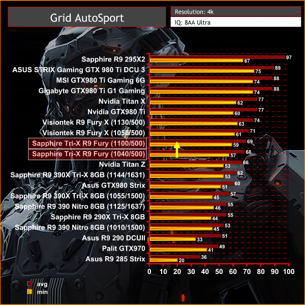 At Ultra HD 4K resolutions the Fury cards perform much better – the high bandwidth architecture can shine. The GTX980 Strix is clearly outperformed at 3840×2160 with these high image quality settings.