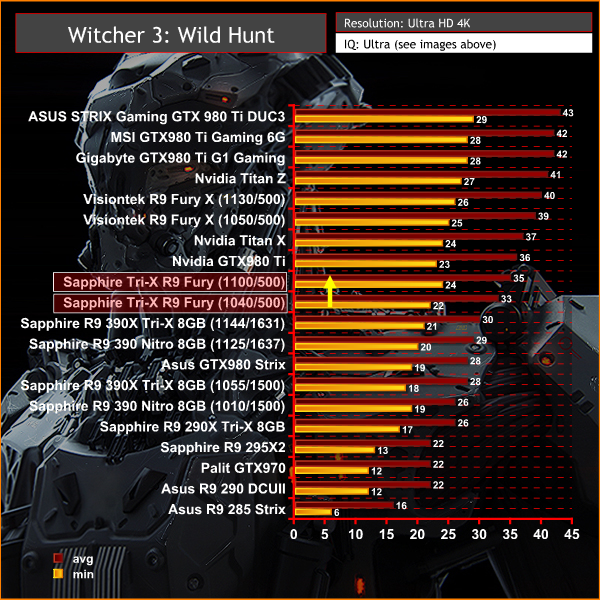 These results are really interesting at Ultra HD 4K because while the Fury outperforms the GTX980 Strix it is the result after overclocking that is particularly interesting. At 1,100mhz the Fury actually manages to almost match the reference clocked GTX980 ti, dropping only 1 frames per second average.