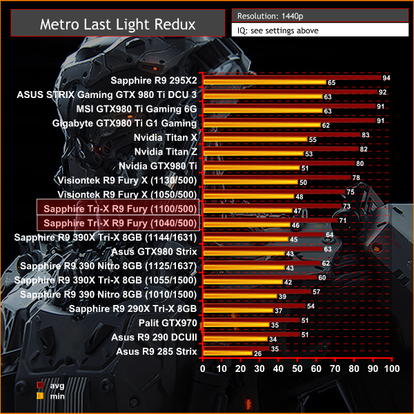 On May 22, 2014, a Redux version of Metro Last Light was announced. It was released on August 26, 2014 in North America and August 29, 2014 in Europe for the PC, PlayStation 4 and Xbox One. Redux adds all the DLC and graphical improvements. A compilation package, titled Metro Redux, was released at the same time which includes Last Light and 2033. (Wikipedia). We test with following settings: Quality-Very High, SSAA-off, Texture Filtering-16x, Motion Blur-Normal, Tessellation-Normal, Advanced Physx-off.