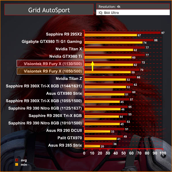 At Ultra HD 4K, the Fury X scores much better against the competition. It is still around 7 frames per second behind the GTX980Ti, but in real world terms, the differences in frame rate are barely noticeable. It is worth pointing out that the Fury X minimum frame rate is almost the same as the reference GTX980 Ti.