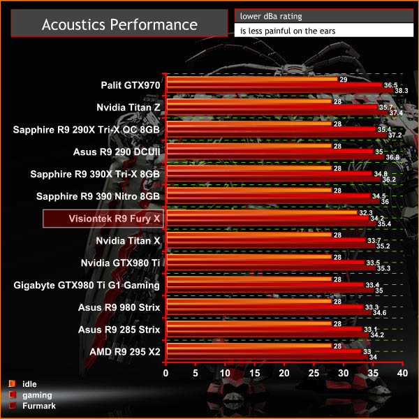 The Fury X is reasonably quiet when idle, but there is pump noise evident at all times.