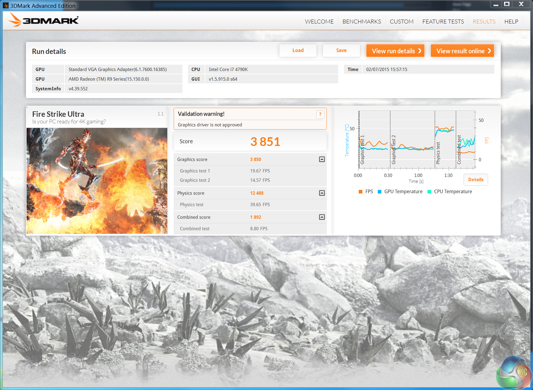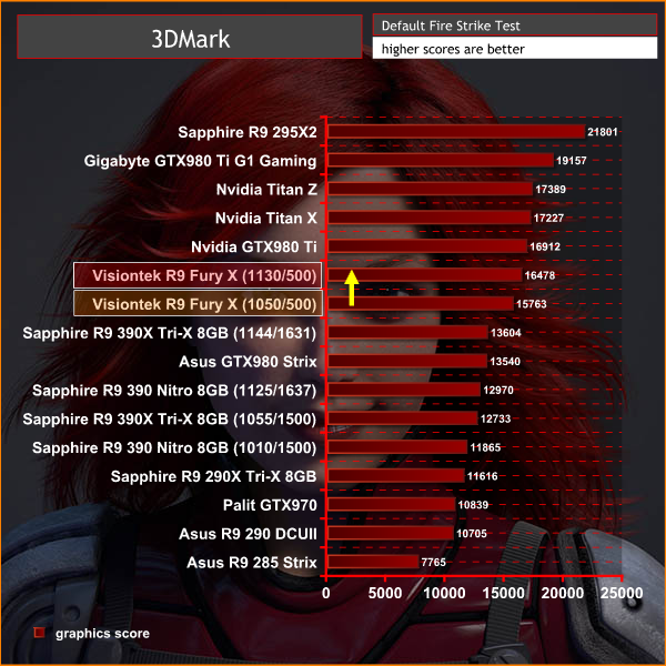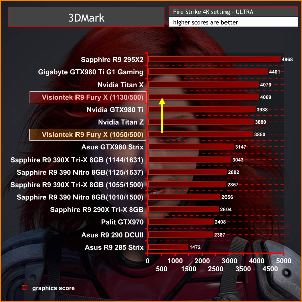 The Fury X 4GB scores well in the latest Direct X 11 benchmark – 3,850 points- placing it just behind the reference GTX980 Ti. When overclocked to the limit the score increases to 4,069 points, just ahead of the reference clocked GTX980 Ti and almost level with the reference clocked Titan X. The Gigabyte GTX980 Ti G1 gaming on the other hand scores 4,401 points, putting it way ahead of the manually tweaked R9 Fury X.