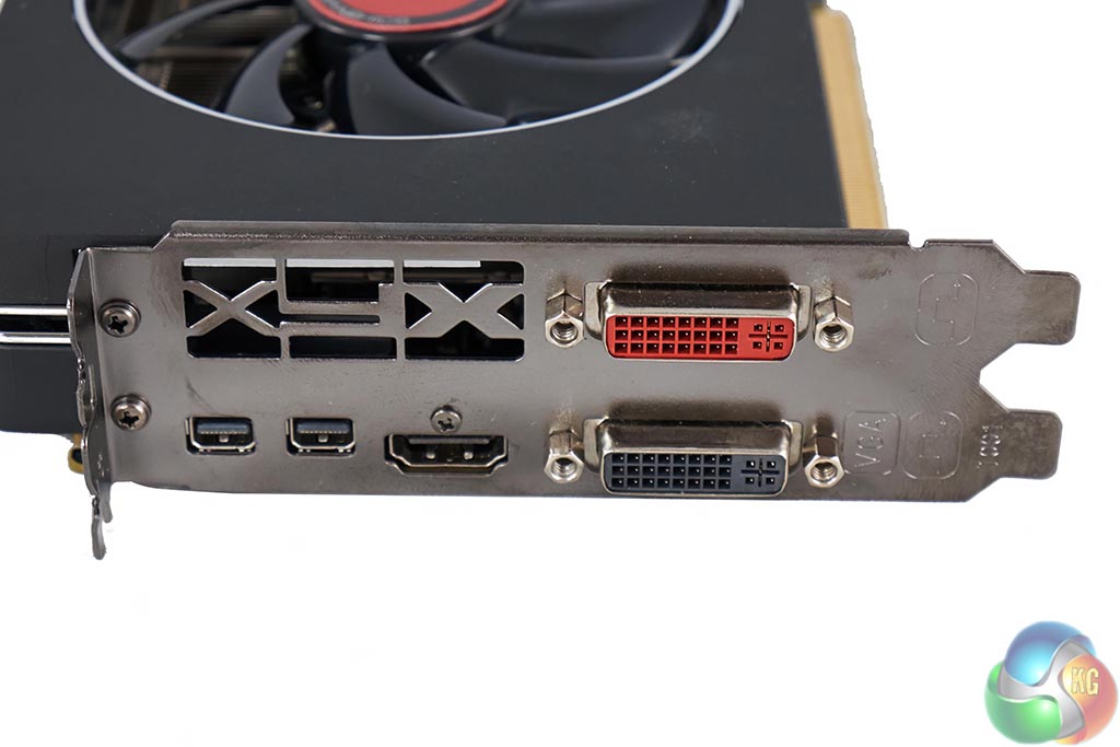 Two DVI connectors, a full sized HDMI connector and two mini DisplayPorts. It is EyeFinity capable, as we would expect.